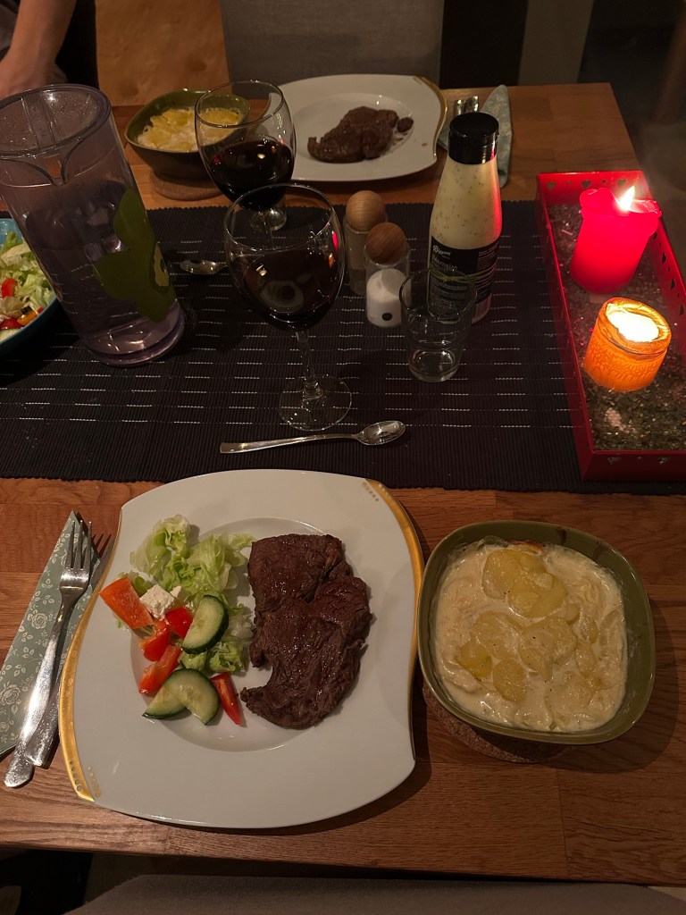 Ikväll blev det lyxmiddag med potatisgratäng och entrecote och pommes och korv till barnen. Till efterrätt blev det hemgjord chokladmousse som fick höga betyg av allihop, nästan gång får det gärna vara lite mörkare choklad i för min del! Men det här var första måltiden på länge utan bråk, och alla satt vid bordet i över en timme! Ett riktigt bra avslut på året om ni frågar mig.