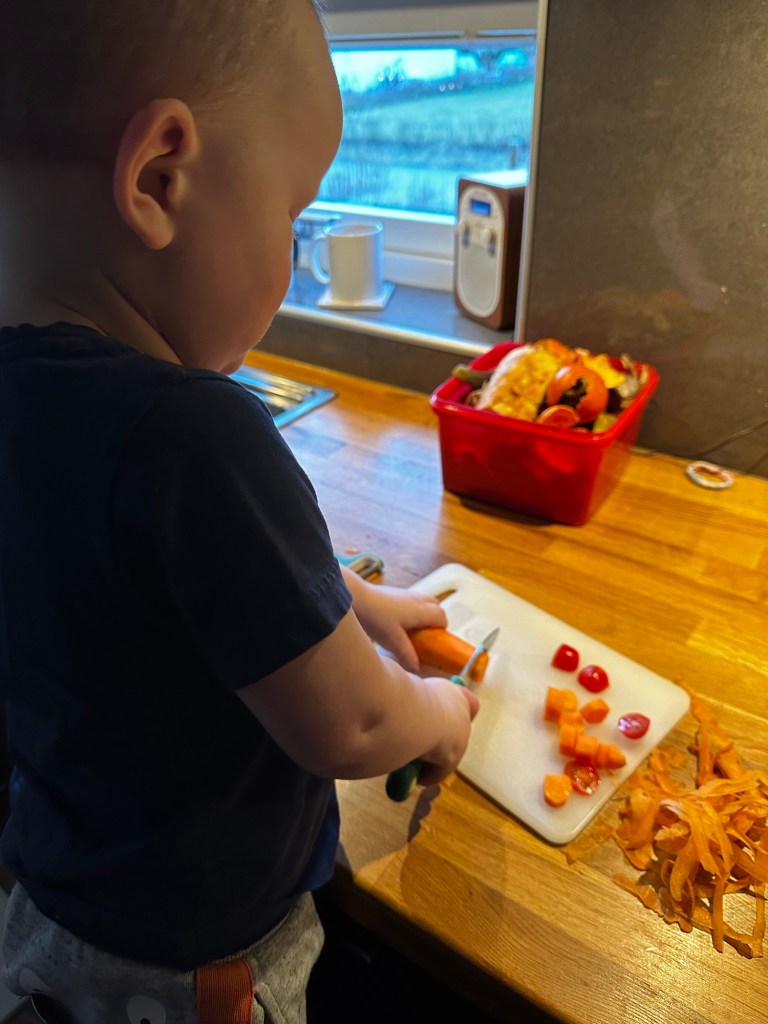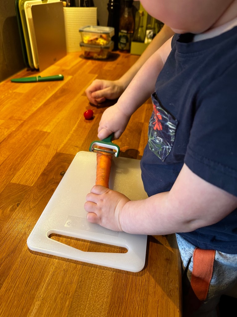 Lite senare var det dags för paket igen och då vår kille älskar att vara med i köket så blev han överlycklig av att få en egen kniv, potatisskalare och egna skärbrädor. Givetvis skulle de även testas direkt.