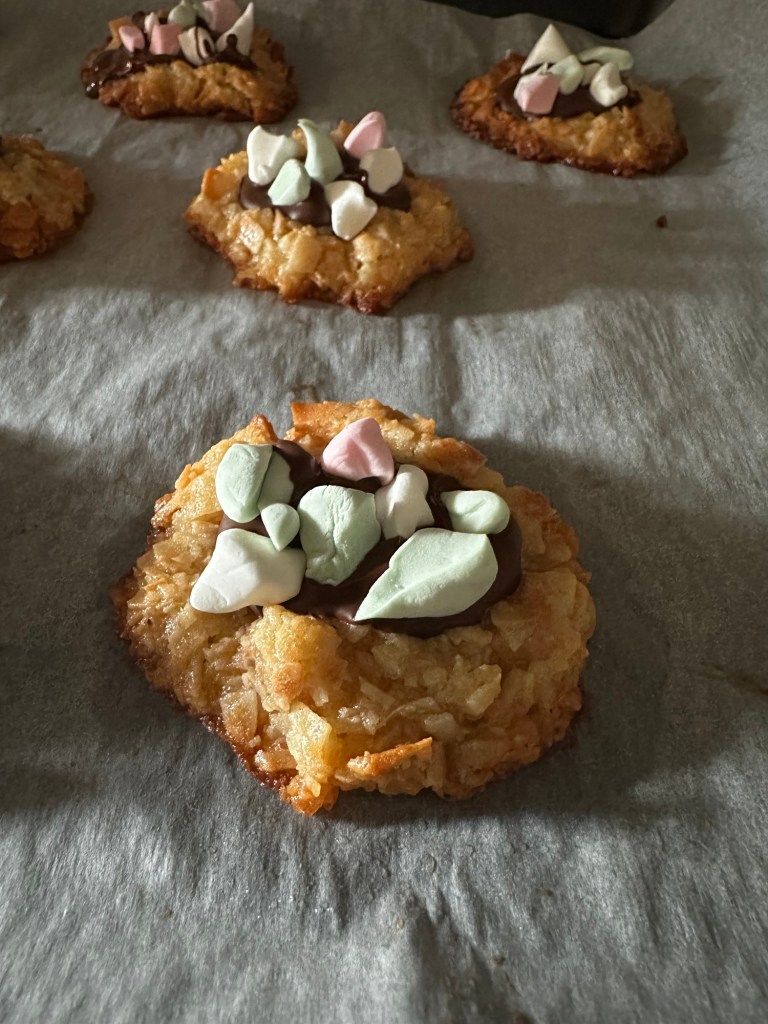 Påskveckan har inletts, och i helgen tog vi inte bara in påskriset. Igår bakade vi fågelbon, eller ja kokoskakor med choklad. Man skulle egentligen lägga krossade godisägg i chokladen men vi hade glömt att köpa det så det fick bli sönderklippta Alhgrens bilar istället, och det blev festligt med färgerna. Det blev kanske helt som det var tänkt från början men barnen tyckte dem var roliga att baka och goda blev dem.