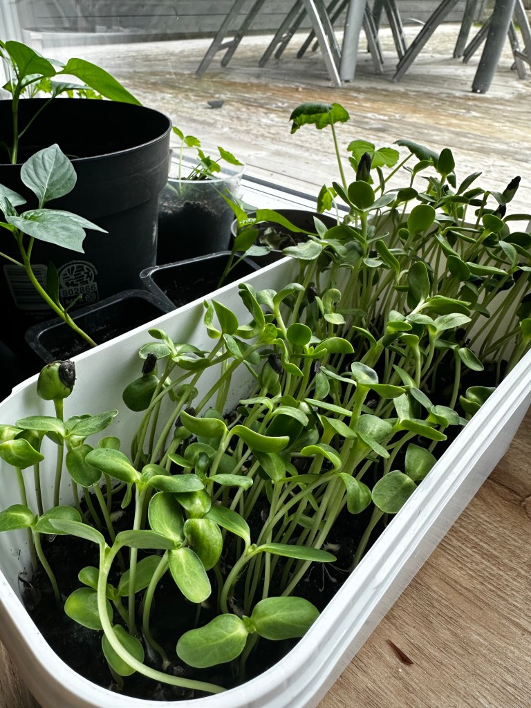 Något som vi odlar här hemma just nu är solrosskott. De växer väldigt snabbt och är både goda och nyttiga att äta. W går och plockar ibland och stoppar i munnen, och vi använder dem i sallad och ätbar garnityr.