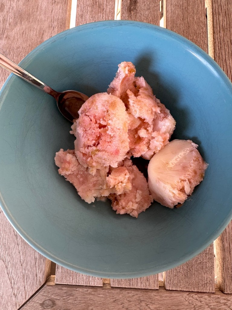 Smart, enkelt och gott! Vi brukar göra ungefär samma glass av mango, hallon och jordgubbar. Perfekt att köpa hem frysta och göra en liten sats vid behov.