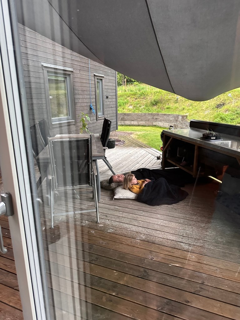Men vi hann iallafall gå en kort promenad med hunden efter förskolan innan ovädret drog in. När vi åt kvällsmat på altanen började det blåsa ordentligt och blixtrarna och mullret rullade in, men utan regnet. Men när maten var undanplockat var det dags, och Joakim och M installerade sig med kuddar och filt ute för att titta på åskan och regnet.