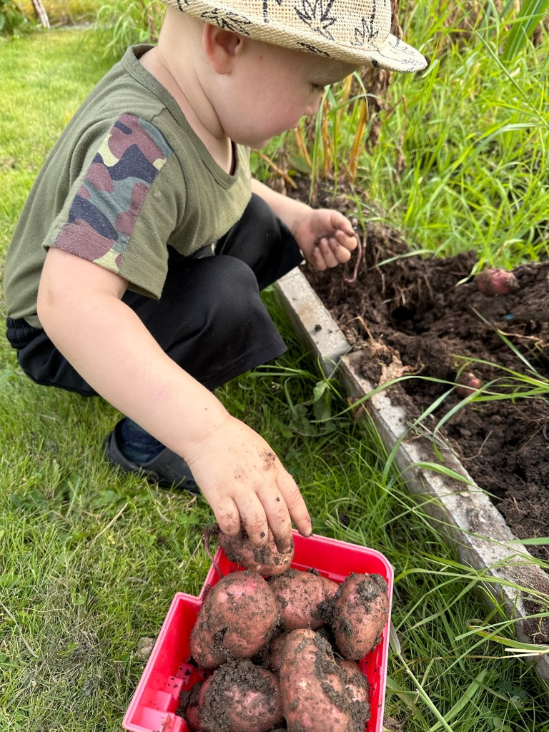 Något som jag är extra tacksam för just nu är ljuset om kvällarna. Hela dagarna tillbringas inne på jobbet, förutom min 15 minuter lunchpromenad som jag tar varje dag. Men det är så skönt att komma hem och vara utomhus. Igår skördade vi potatis till kvällsmaten, och W hittade även lite maskar som han tyckte var intressanta. Sedan kunde jag så i uteköket i potatisen, och som vi har använt uteköket – ångrar inte en sekund att vi byggde det.