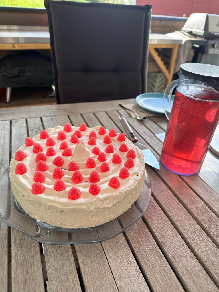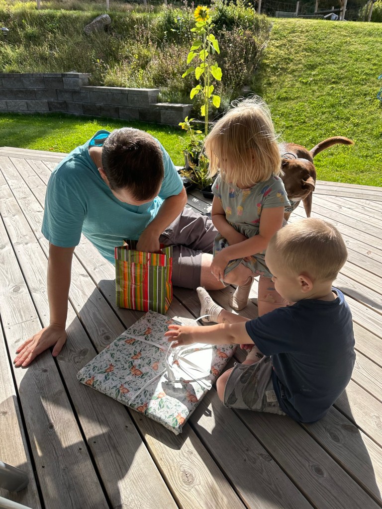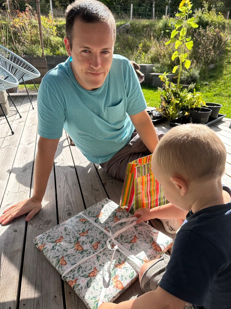 De hade bakat en tårta under förmiddagen odon vi åt på altanen och givetvis blev det lite paket också. Han fick en stekhäll för grillen och lite gott tilltugg.