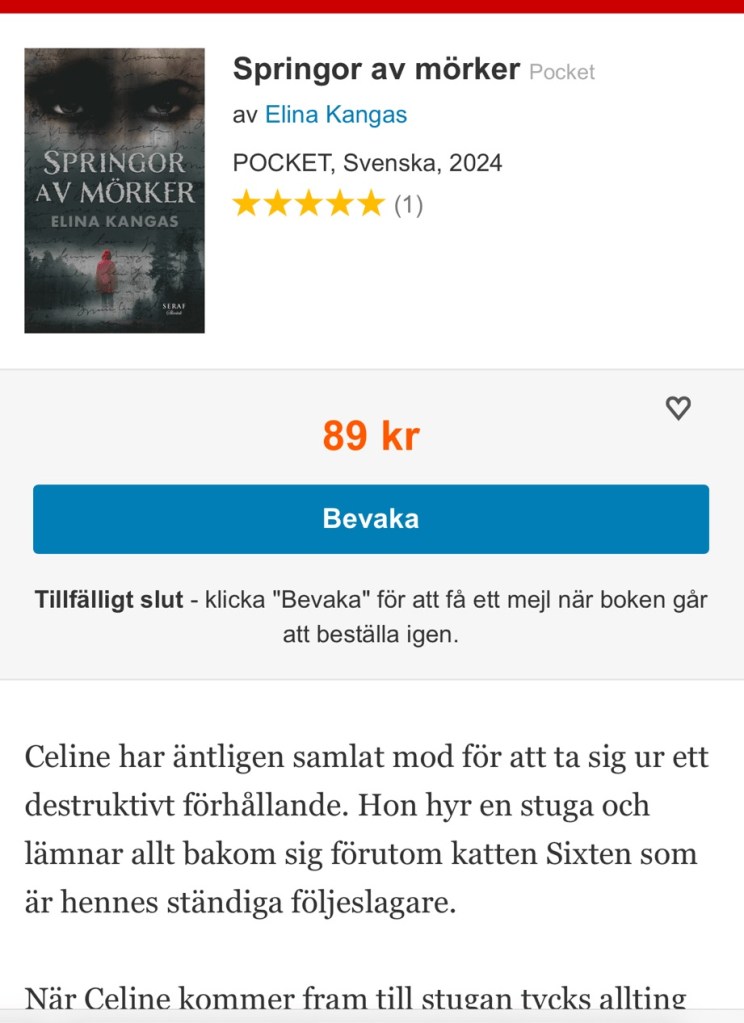 En annan rolig nyhet nådde mig idag. Min bok Springor av mörker har sålt slut hos nätbokhandlarna! Det känns helt overkligt, och tanken att den skulle kunna sälja slut har varit något som känts som en avlägsen dröm. Men nu har det hänt, och det ska firas! Om någon är intresserad av en signerad bok så har jag några kvar hemma.