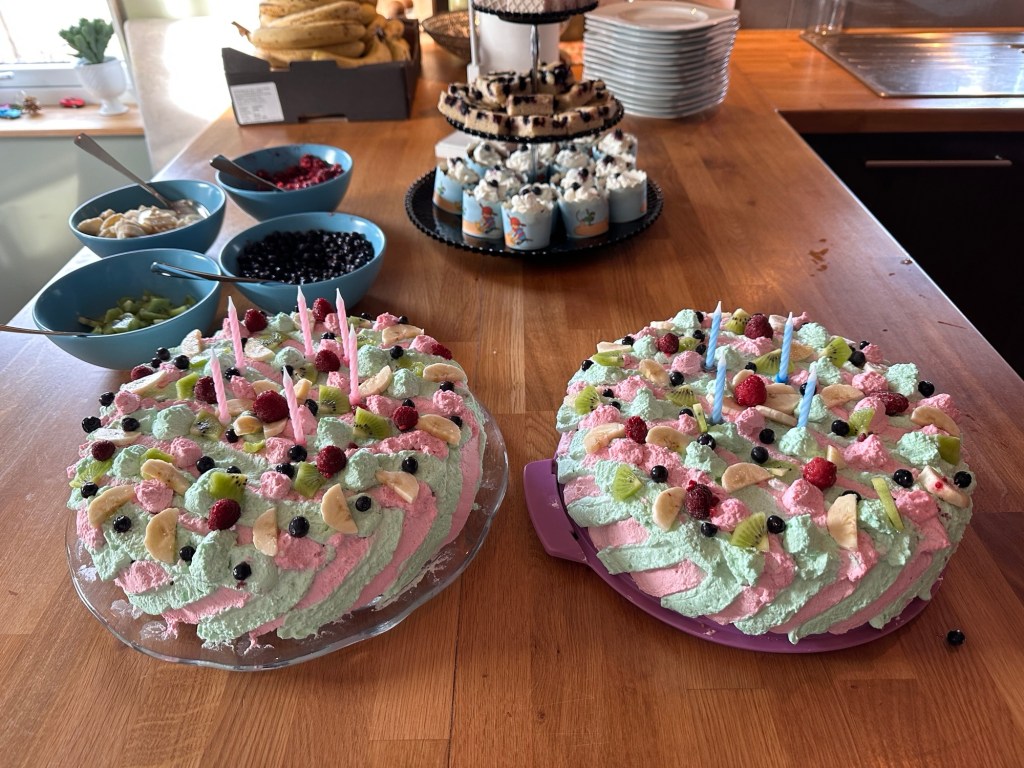 Några fortsatte vidare med barnen till en lekpark medan andra tog hundarna på en runda. Under tiden gjorde jag iordning för fikat och dekorerade det sista på tårtorna. Joakim hade bakat tårtor och då barnen efterfrågat regnbågstema på sina tårtor så hade spritsat rosa och grön grädde i ett vågigt mönster över dem. Allt detta kompletterades sedan med bär och frukt till ett par festliga och uppskattade tårtor. Tänk att våra barn redan är 4 och snart 6 år, helt otroligt!