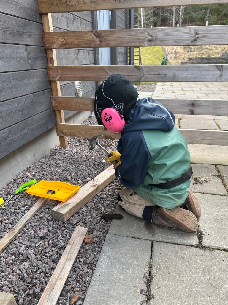 Idag har det blivit desto lugnare men vi har ändå hållit oss sysselsatta. På förmiddagen var vi ju tvungna att testa lite av presenterna de fick. Vi gör en dinosaurie som ska målas imorgon och M höll på med sin sminkdocka. Då vädret var bra idag också blev det även att gå ut och testa verktygen som W fått.