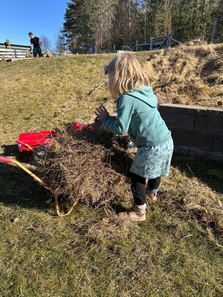 Vi började med att plocka undan vinterkläderna och sedan gav vi oss ut i vårsolen. Bilarna tvättades och fick sommardäck, cyklar och andra uteleksaker togs fram. Jag gav mig på att rensa bort fjolårsgräset och gammalt ogräs i slänten och dessutom fin hjälp av två små hjälpredor som lekte att de skulle mata djur.