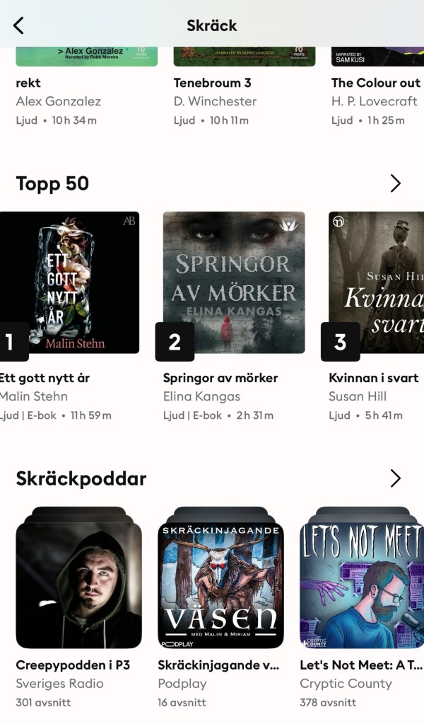 En annan rolig sak är att Springor av mörker har varit ute som ljudbok i en vecka idag, och just nu ligger den på andra plats på topplistan för skräck hos Storytel! Så kul, och jag är otroligt glad att det är folk som vill lyssna på den. Är väl medveten om att den inte passar alla, och vilken bok gör det? Och just nu tänker jag bara vara glad över de fina ord den har fått.