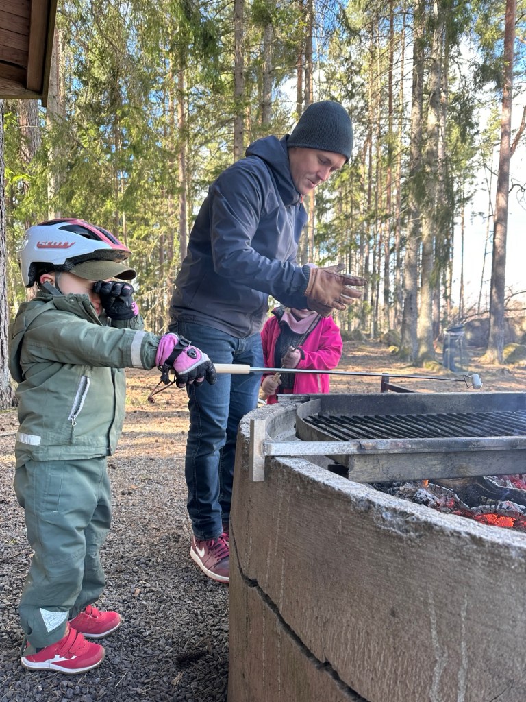 Det var ju typiskt att det skulle bli kyligare idag när vi hade planerat att ha korvgrillning med ett par vänner. Men när de kom till oss tog vi ändå en promenad till skogen för att grilla. Det var skönt när man var i solen och i rörelse. Om man stod stilla var vinden inte nådig tyvärr, men eld fick vi och vi grillade både korv och lite marshmallows. Det är alltid något speciellt med att äta utomhus.