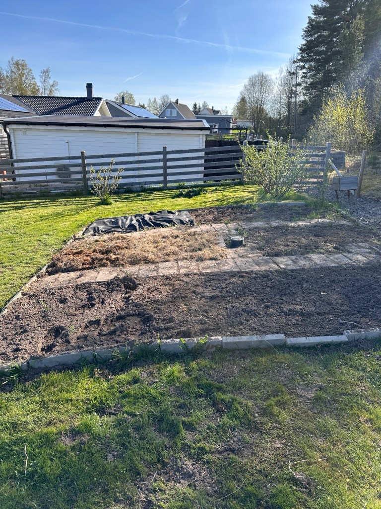 Som ovan antyder så gick söndagen i ett. Efter frukost fixade vi i ordning lite matsäck och jag hann sätta ut alla våra krukor med plantor så de får acklimatisera sig för att flytta ut. Måste bara visa hur trädgårdslandet ser ut nu efter att vi rensade igår. Vi kör med täckodling och där gräsklippet ligger gror nu frön för fullt och i helgen som kommer ska potatisen sättas också.