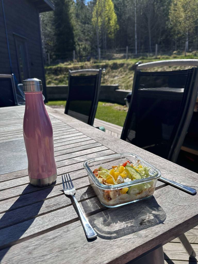 Ute har jag iallafall försökt vara så mycket som möjligt. När jag tar mina bensträckare från datorn går jag ofta ut på altanen en liten stund och njuter av vädret. Vid lunchen var det så pass skönt att jag kunde sitta ute och äta. Det känns verkligen som en av de lyxigaste sakerna med att jobba hemma.