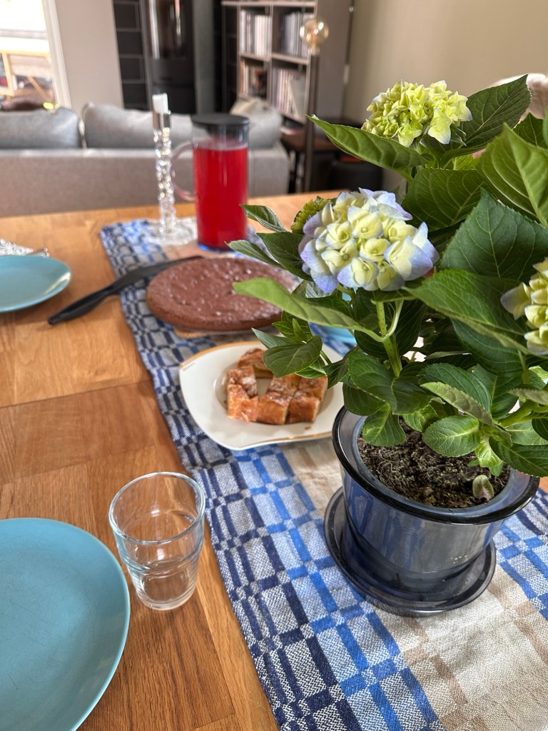 Igår var det min och Joakims bröllopsdag, och givetvis skulle det firas. När barnen var hämtade på förskolan så blev det en gofika med kladdkaka och wienerbröd. Joakim hade köpt med sig blå hortensior hem, samma som jag hade i min brudbukett. Utanför trädgården blommade vitsipporna för fullt och drog minnet tillbaka när vi stod i ett hav av vitsippor för 7 år sedan och tog våra bröllopsbilder. Blir alltid påmind om det när jag ser vitsipporna blomma och det är en mysig påminnelse att ha.