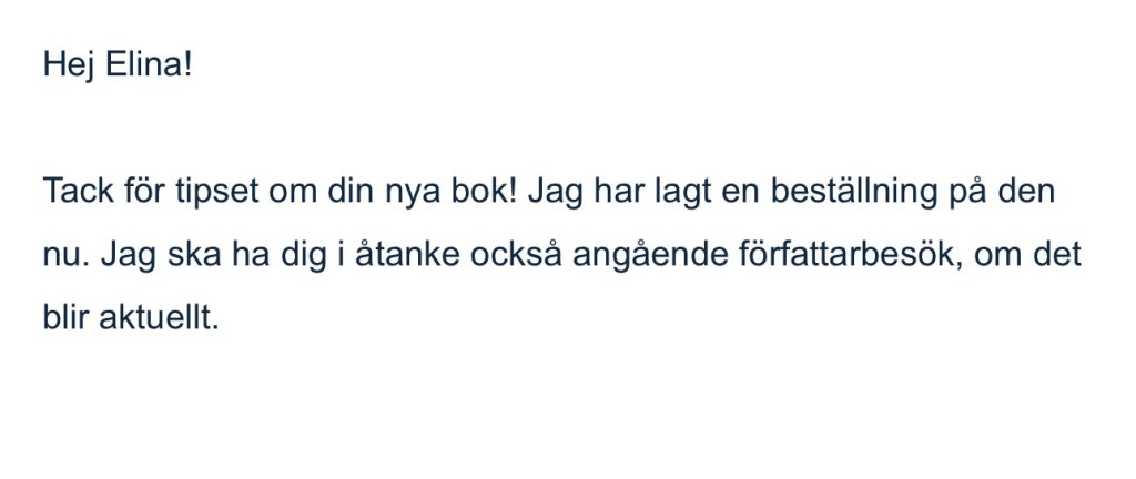 Jag har börjat mejla bibliotek för att tipsa om min bok Bundna själar som släpps 17:e juni. Oftast får jag inte svar på dessa tipsmejl men ibland händer det och idag var ett sådant tillfälle. Alltid lika roligt när ett bibliotek väljer att köpa in ens bok!