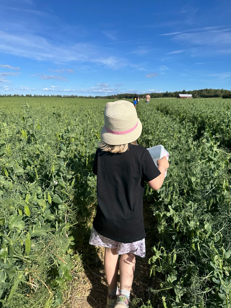 Igår efter jobb och förskola åkte vi och plockade jordgubbar. Det är en riktig sommarkänsla för mig, och vädret var fantastiskt. Detta året fick vi även gå mellan en massa ärtor för att komma till jordgubbarna, och det är något magiskt med fält tycker jag.