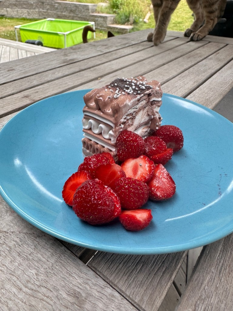 Nu har vi semester! Idag vid strax efter klockan 15 stängde jag av datorn och gick för att hämta barnen på förskolan och ta semester. Det var dessutom M:s sista dag på förskolan, till hösten börjar hon förskoleklass. Jisses så fort tiden går, vår lilla tjej börjar verkligen bli stor. Och snart inleds ett nytt kapitel i livet. För att fira hennes sista dag på förskolan, semester och sommarlov blev det glasstårta, jordgubbar och strössel.