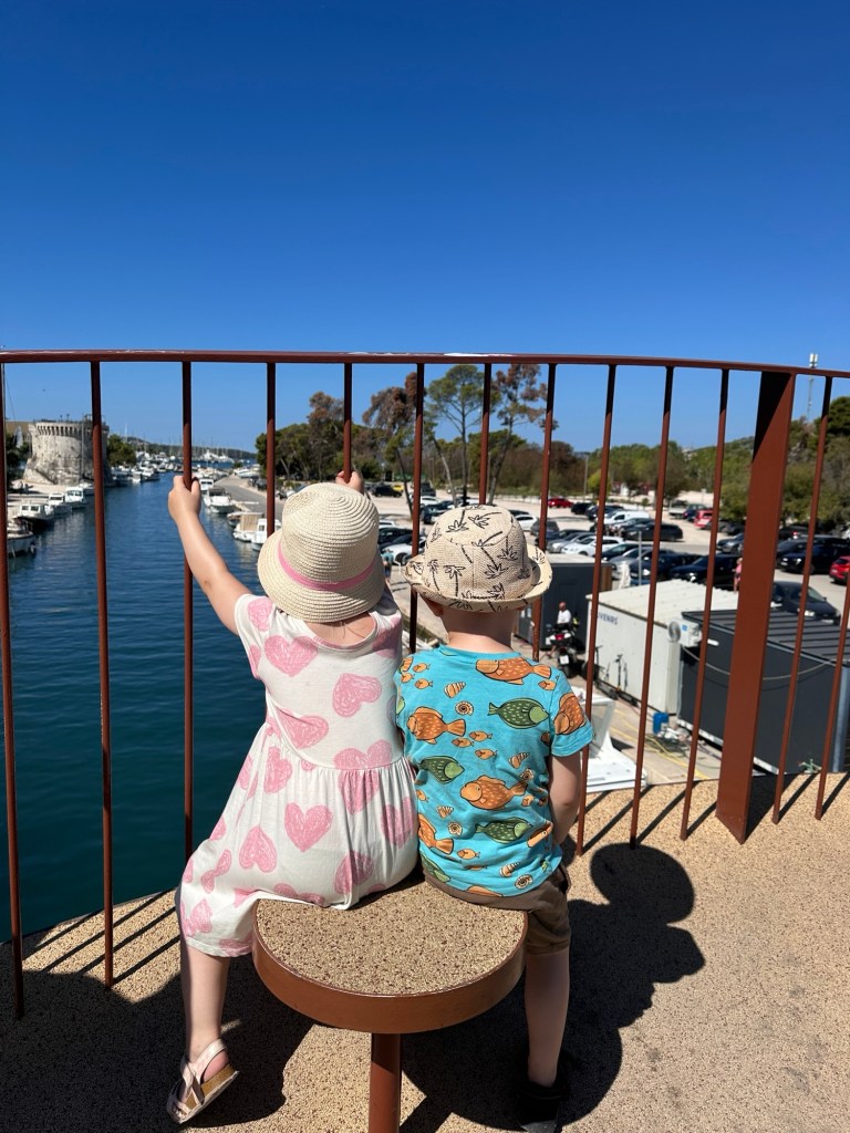 Vi fick stanna ett par gånger för en vinddruvspaus i skuggan, vilket var välbehövligt då det var väldigt varmt. Till slut kom vi tillbaka till lägenheten, där vi packade det sista och åt vindruvor och choklad innan vi checkade ut. Barnen placerade sig framför fönstret med utsikt över Gamla stan.