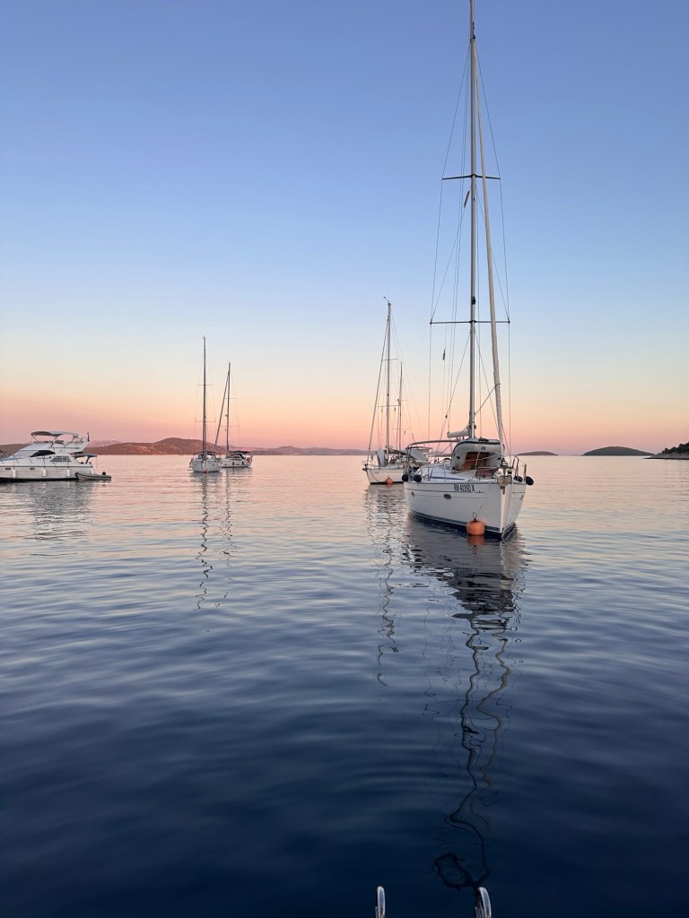 När vi var ute i havet igen tog vi sikte på ett par öar på kartan för att leta efter ett ställe att sova för natten och vi hittade en jättefin vik där vi la till på en boj.