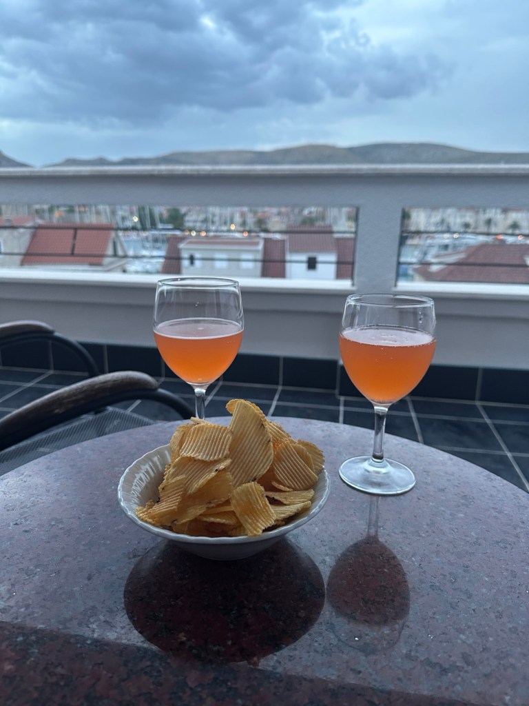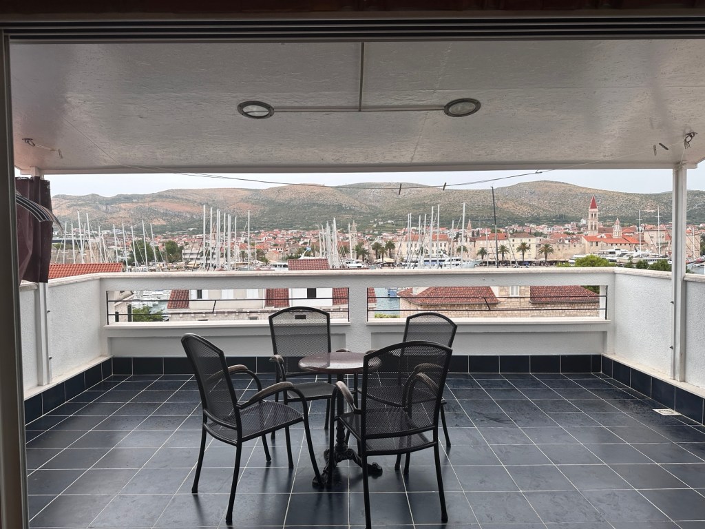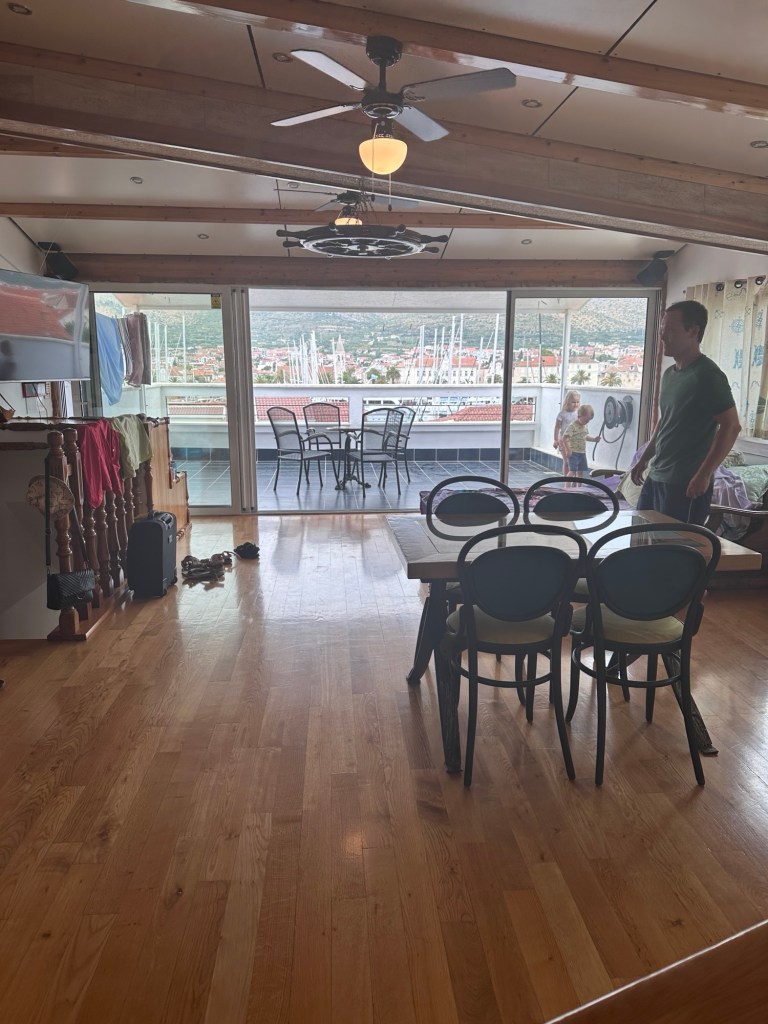På så vis kunde vi även gå iland smidigare med väskorna och barnen mellan regnskurarna. Vi bokade en Uber, första gången för oss och så smidigt det var, och åkte till Trogir där vi hyrt en lägenhet för ett par dagar. Lägenheten var större än vad vi trodde efter sett bilderna med en balkong med utsikt över marinan och gamla staden. Dessutom var det en terrass under med en egen pool, som vi använde väldigt mycket under dagarna vi var där.