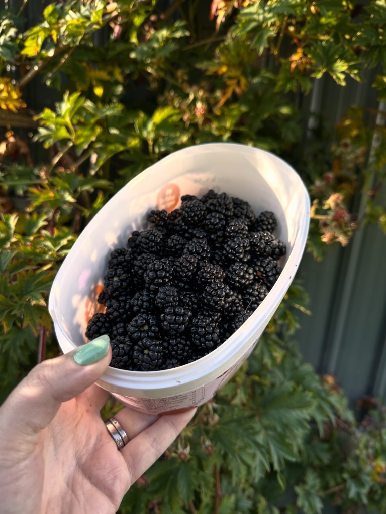 Björnbär är ett av mina favoritbär, så himla goda. Grannen har en stor buske som vi får ta av, men vi är ju så sällan hemma. På Öland växter björnbär fritt, så där blir det ju att man tar när man har möjlighet. Nu blev jag riktigt sugen 🙂