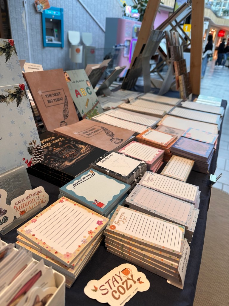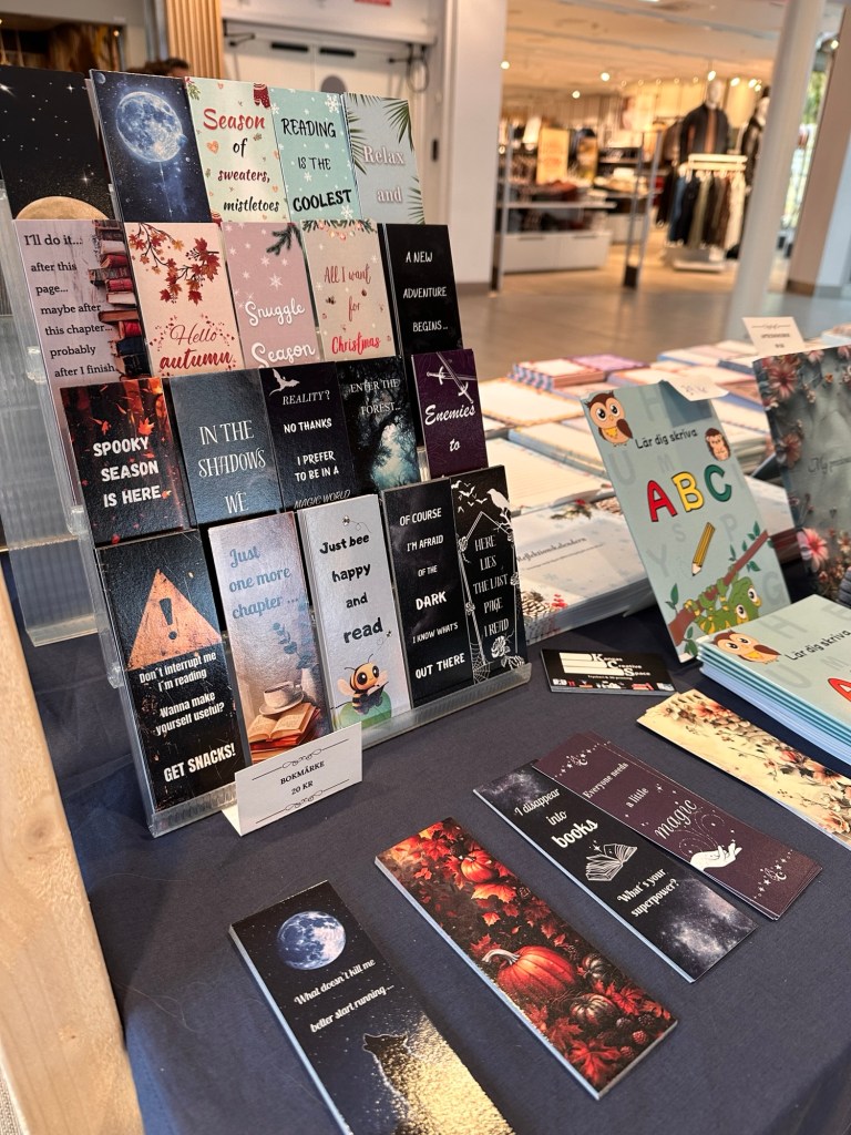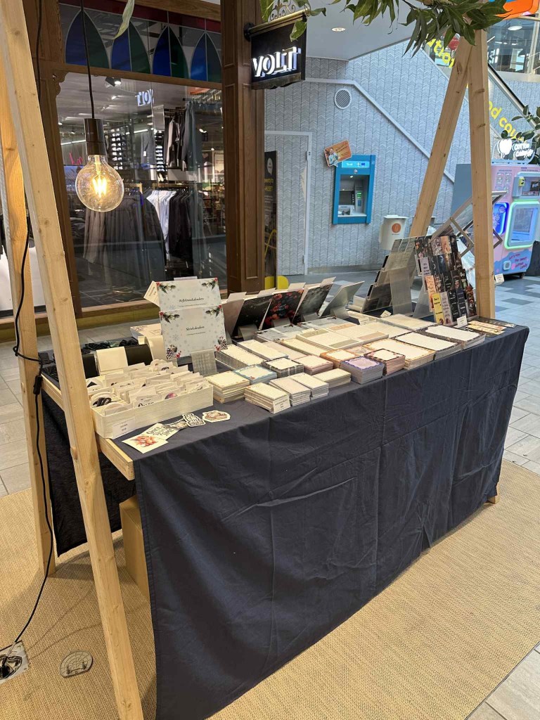 Igår stod vi med tryckeriet i I-huset här i Linköping. Så det har varit en del förberedelser inför det under veckan också, och igår var det alltså dags. Joakim tog första passet och ställde upp allting och efter lunch åkte jag in med barnen och bytte av honom så fick han åka hem med dem. Så jag stod där på eftermiddagen fram tills köpcentrumet stängde. Jättekul att komma ut med våra produkter och visa upp oss, och det är ju något vi behöver göra mer för att fler ska upptäcka oss. Och det var kul att testa att stå i ett köpcentrum. En massa härliga möten blev det, och vi är så glada för responsen som vi och våra produkter fick.