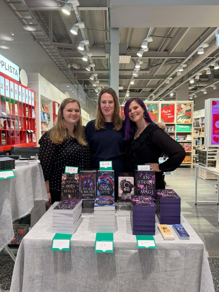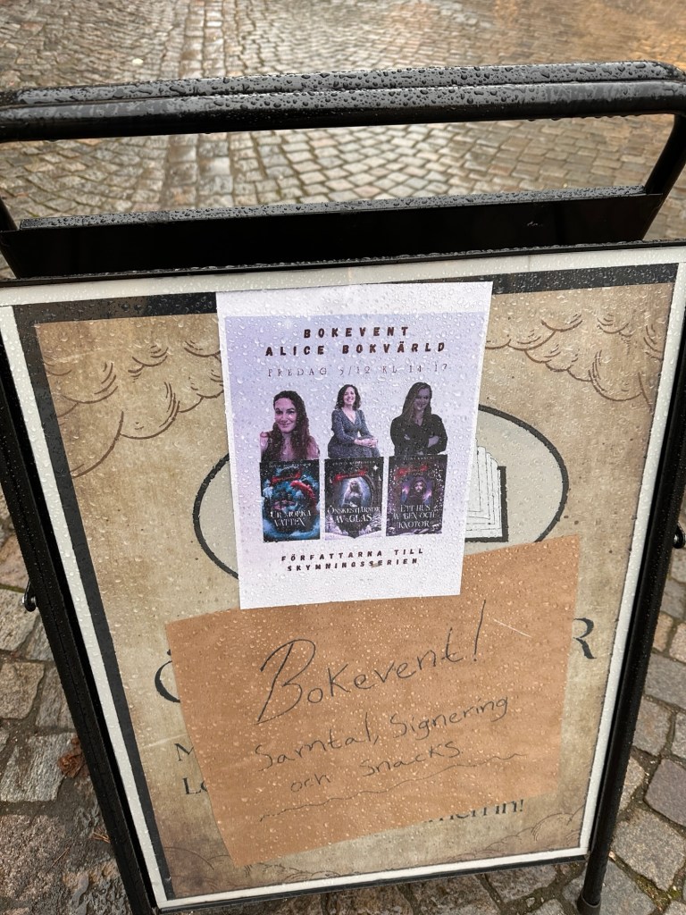 De senaste dagarna har blivit en liten form av signeringsturné. I fredags hämtade jag min vän och författarkollega Sofia och tillsammans åkte vi ner till Sölvesborg och Alice bokvärld. Där mötte vi upp vår vän och författarkollega Olivia, det var vi tre som skulle ha bokeventet tillsammans då vi har skrivit varsin del i serien Skymningssagor. Alla delar i serien är helt fristående och en retelling av en klassisk saga, där min bok ”Ett hus av ben och knotor” är en retelling Hans och Greta.