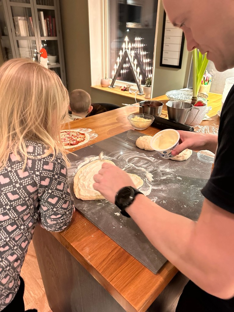 Efter ett par timmar utomhus har det skönt att komma in i värmen igen. Och efter eftermiddagens pulkaåkning blev det varm choklad och innelek innan det var dags att göra kvällens pizzor. Båda barnen var med och bakade och gjorde sina egna pizzor. Riktigt fina blev dem, och goda! Barnen åt upp hela sina pizzor i ett nafs, både jag och Joakim var lite chockade faktiskt men så roligt att de gillade dem.