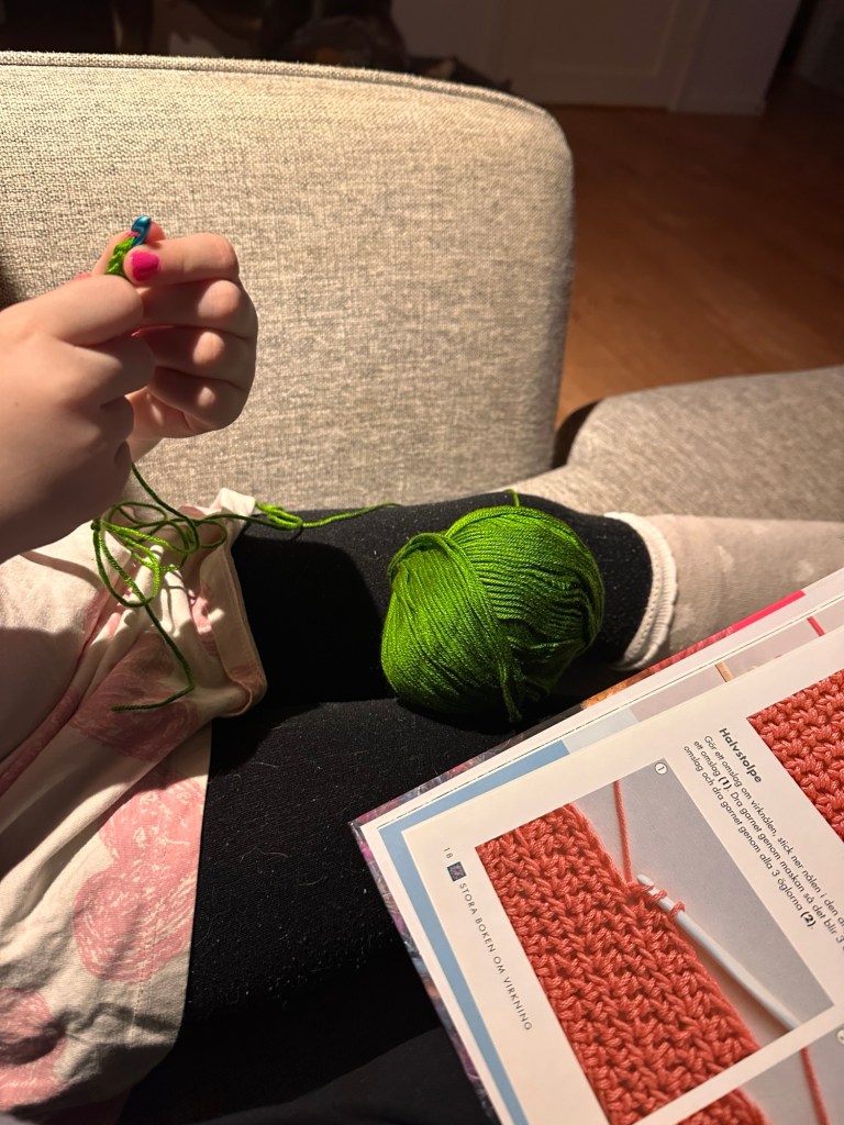 M har pratat ett tag om att hon vill lära sig virka, så ikväll tog vi tag i det. Så nu har vi något att pyssla med på kvällarna, och hon är så taggad på att fortsätta imorgon.